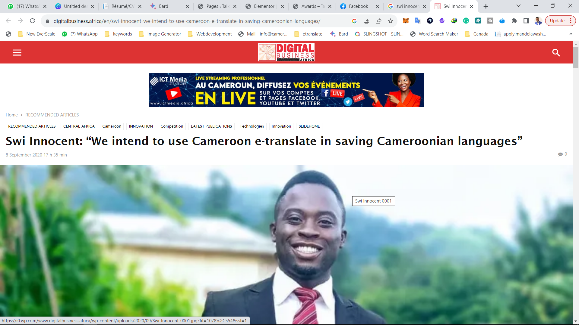 Swi Innocent won the second prize of the national competition for the best ICT project of the year held during the Cameroon ICT and Innovation Week with his project named “Cameroon e-translate”. The results of this competition were unveiled in Yaounde the last 28th of august 2020. In this interview with Digital Business Africa, he explains the objectives of his project.